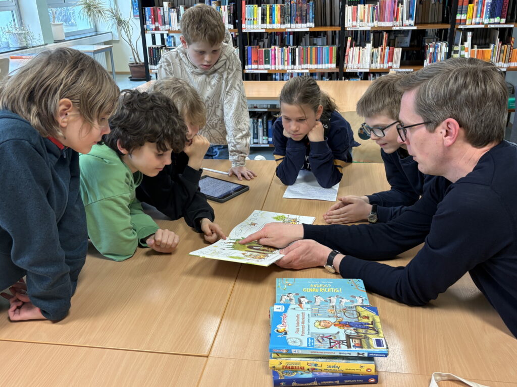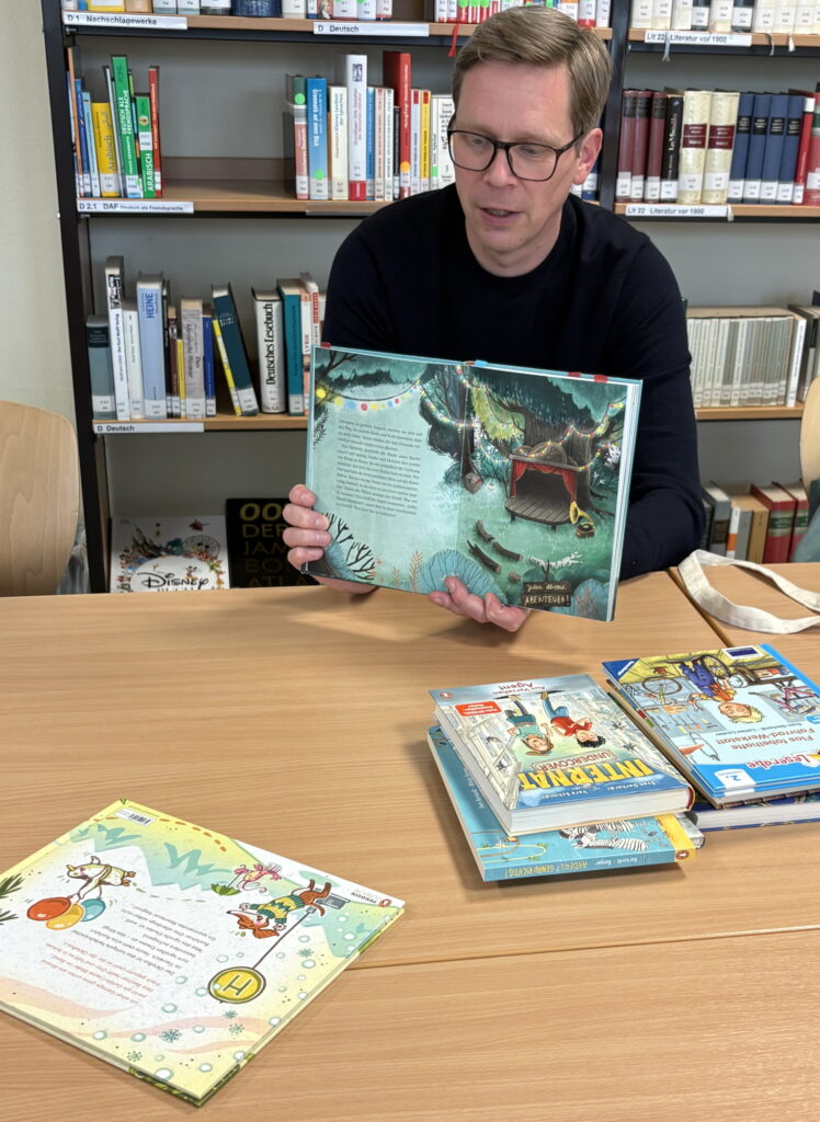 Am vergangenen Montag war der bekannte Kinderbuchautor Sven Gerhardt zu Besuch in der AG Leseclub. Der Autor der „Heuhaufen-Halunken“ hatte eine große Tasche mit einer Auswahl seiner Bücher und jede Menge Zeit mitgebracht und stellte sich geduldig allen Fragen der Schülerinnen und Schüler.