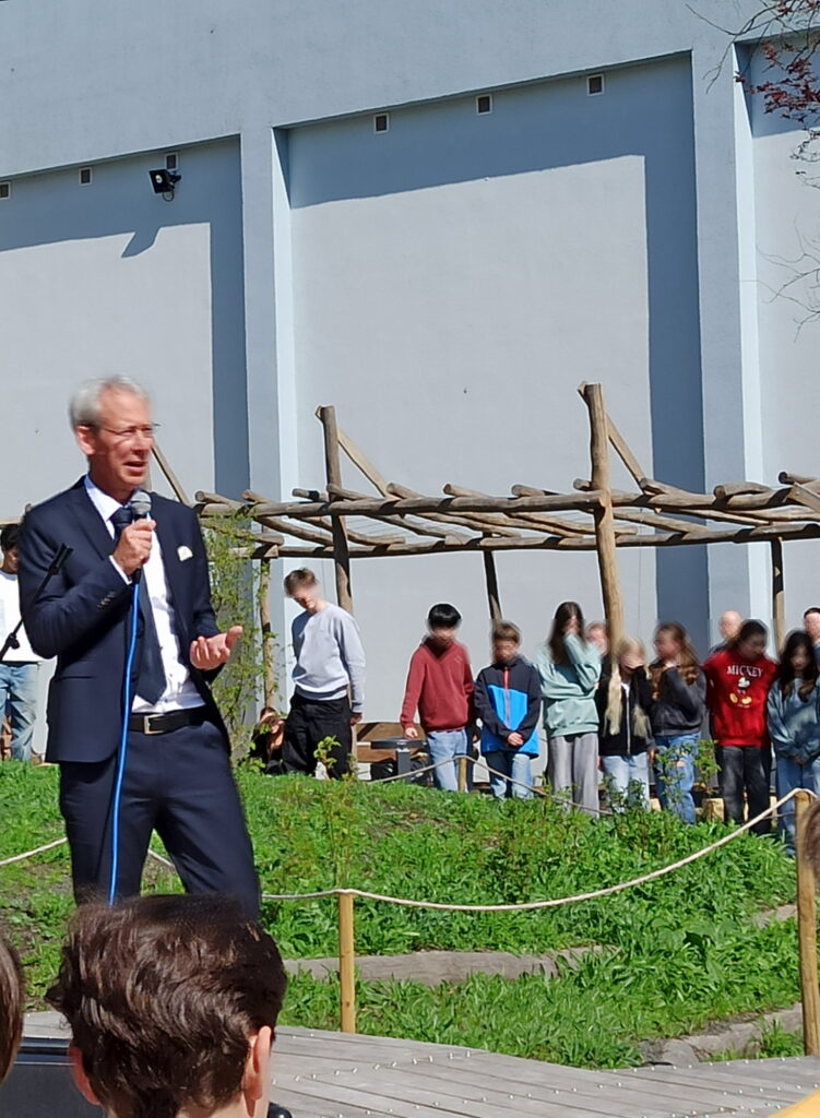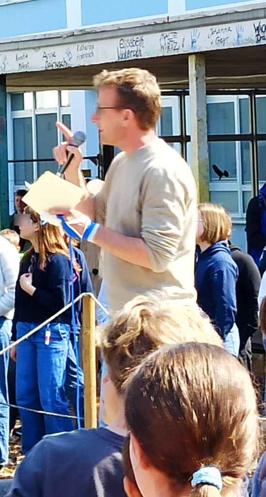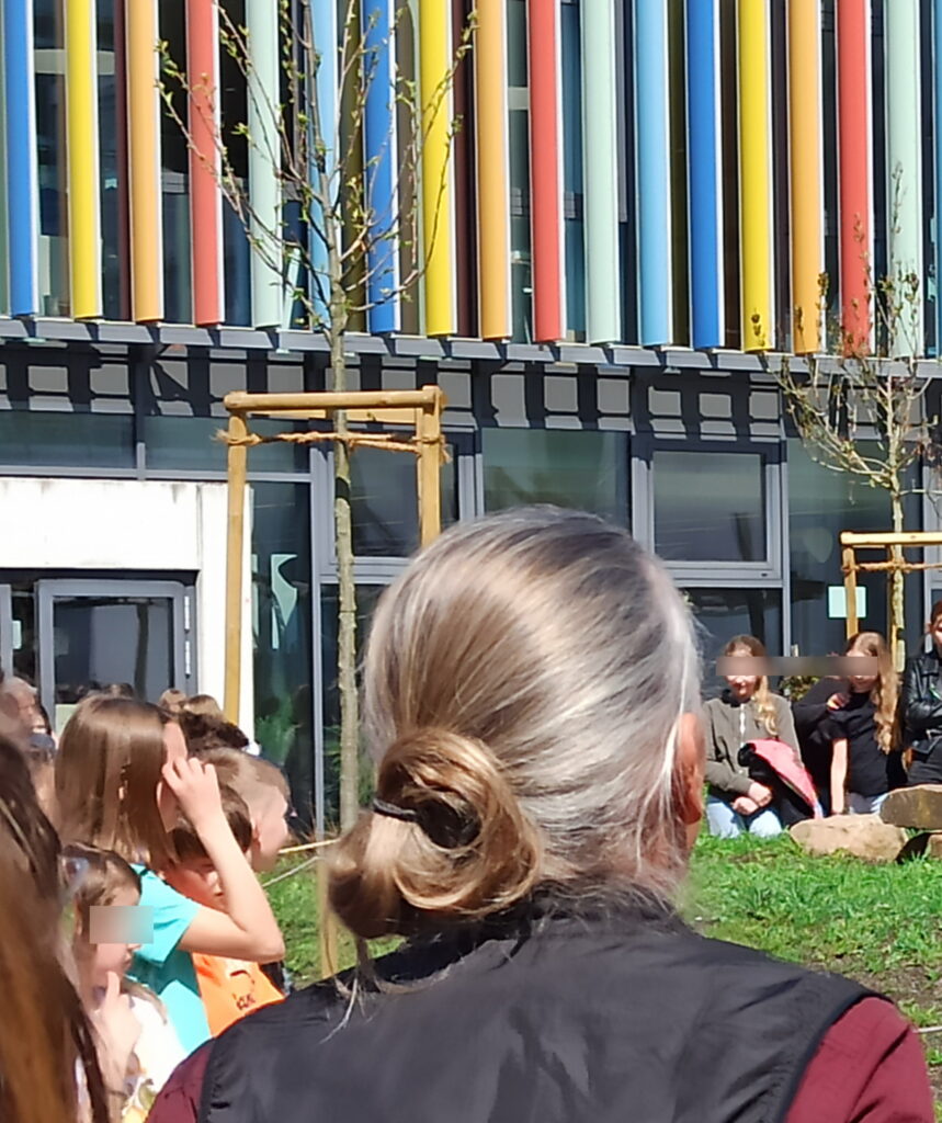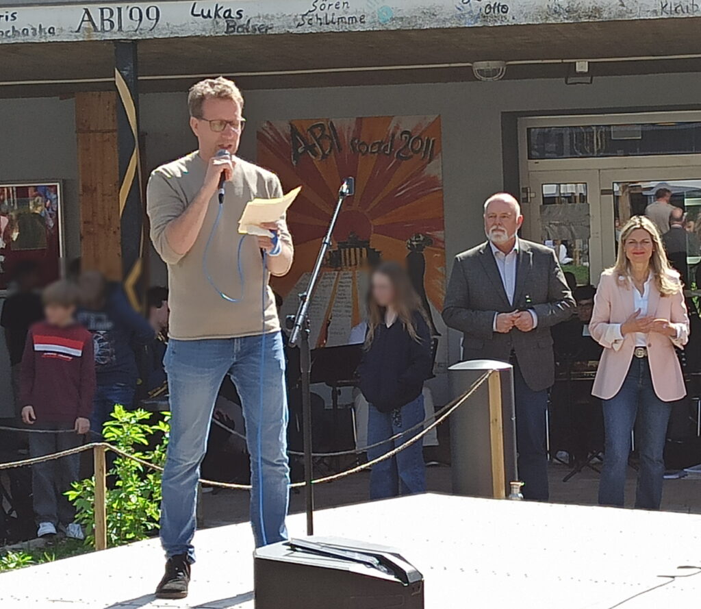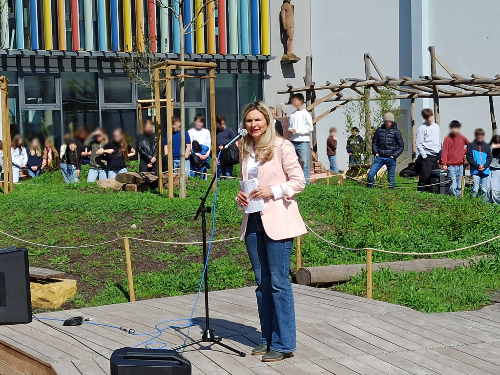 Weitere Ansprachen von Vertretern der Stadt wie der Bürgermeisterin und unseres Schulleiters folgten. Das tolle Resultat ist ein Gemeinschaftswerk der beteiligten Firmen, Schülerinnen und Schülern, Lehrkräften und städtischen Bediensteten, die immer wieder in die einzelnen Bauprozesse involviert waren und im Rahmen der Budgetvorgaben sowie über Kompromissfindungen den grünen Innenhof realisierten.