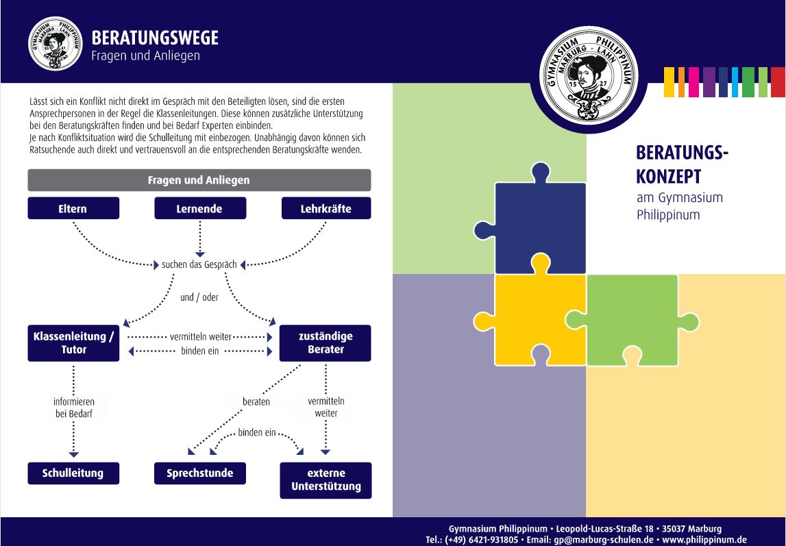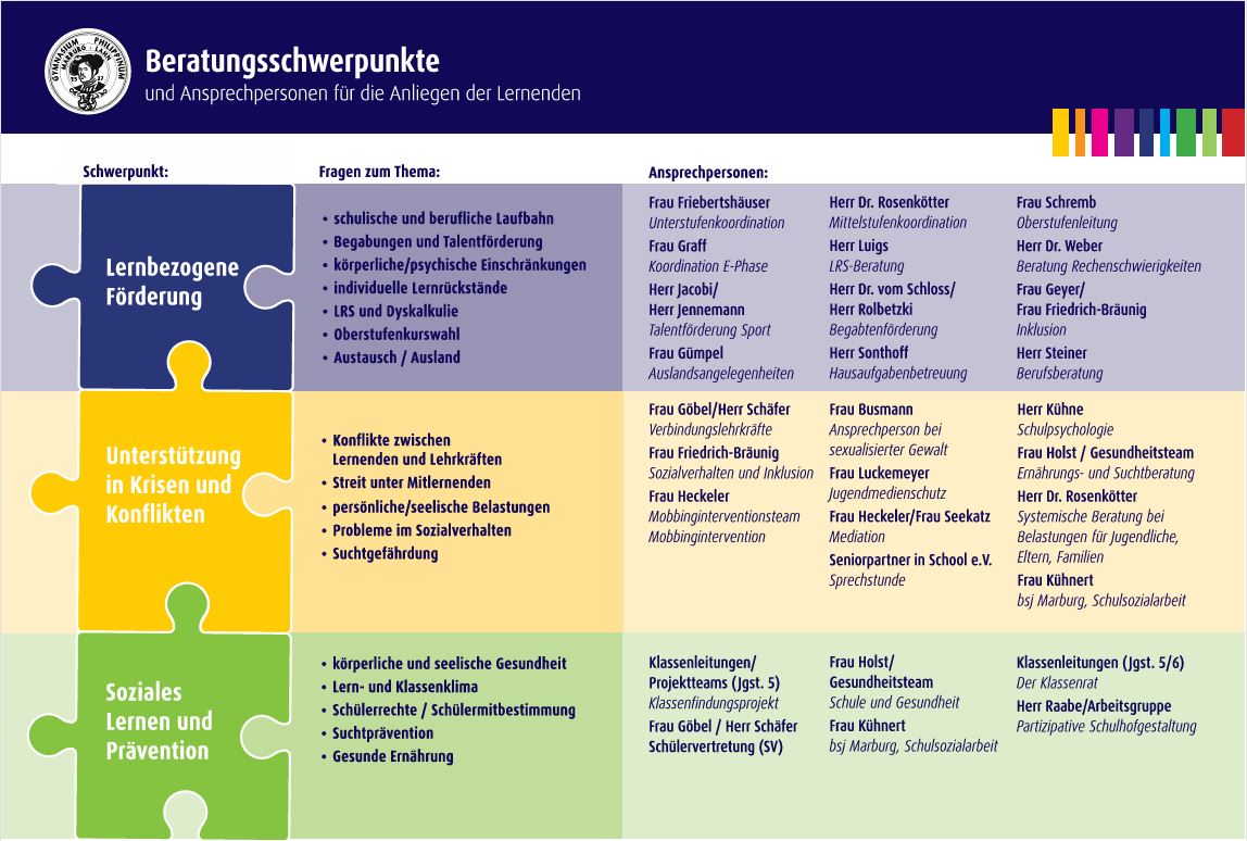 In persönlichen Krisen kann man sich zur Erstberatung an unseren Sozialpädagogen Herrn Sonthoff wenden, oder an die Verbindungslehrer Frau Gümpel und Herrn Schäfer, oder an Frau Holst (Schule & Gesundheit). Zusätzlich erhält unsere Schule Unterstützung durch Herrn Wild, Förderlehrer an der Schule am Schwanhof, sowie den zuständigen Schulpsychologen am Staatlichen Schulamt Marburg.